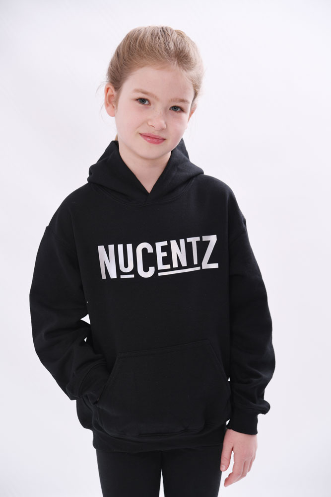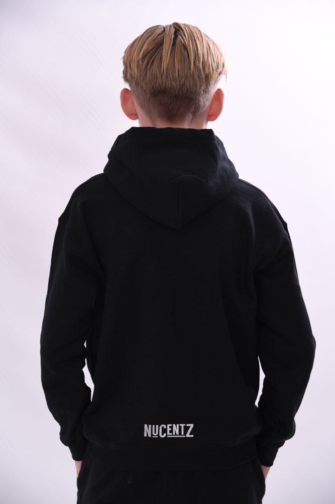 Nucentz Kids Hoodie – The reflective Nucentz hoodie, branding to chest and lower back. Made with heavyweight cotton construction. Details; Black colour, draw tie hood, long sleeves, ribbed cuffs and waistband, Kangaroo pocket, regular fit.